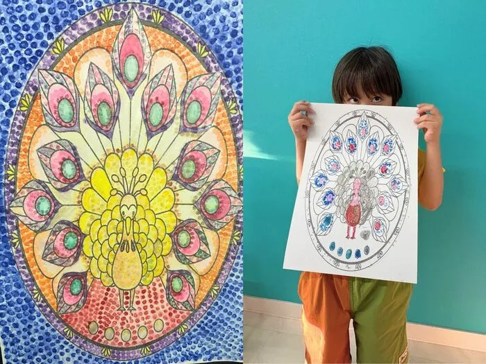 羽や背景の色を自由に選びながら、クジャクの美しさを表現しました✨