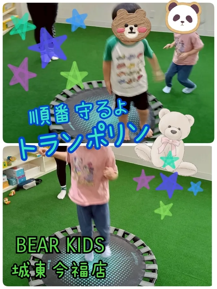 トランポリンでは「10秒交代」のルールを守りながら遊ぶことができ、なわとびを出したり、トンネルの中にボールを入れて、お互い遊びの提案をしたり体をたくさん動かしました☺️