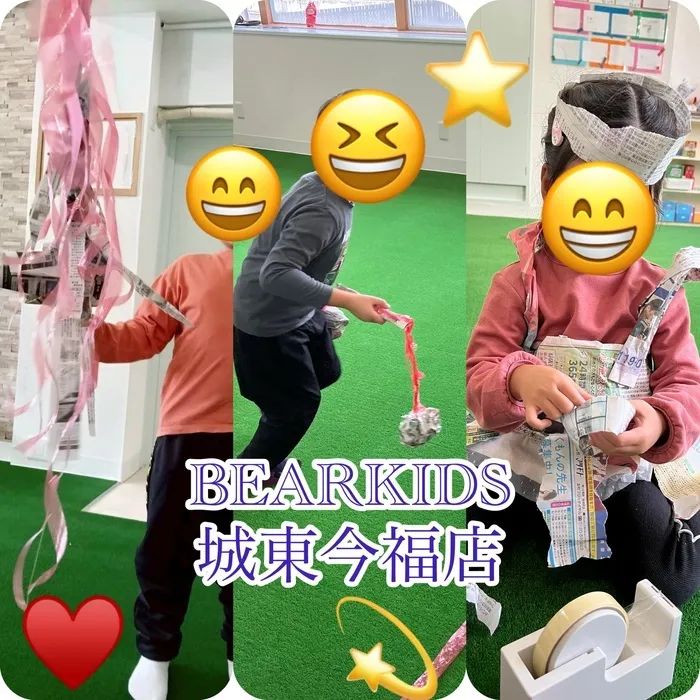 土曜日は新聞紙を使った楽しい制作あそびを行いました。