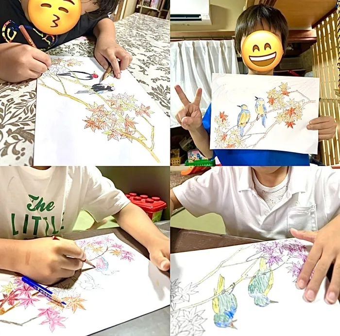 子ども達にとって、まだ紅葉は馴染みないかもしれませんが、秋らしい暖色の色鉛筆を使って綺麗に塗り上げてくれました✨