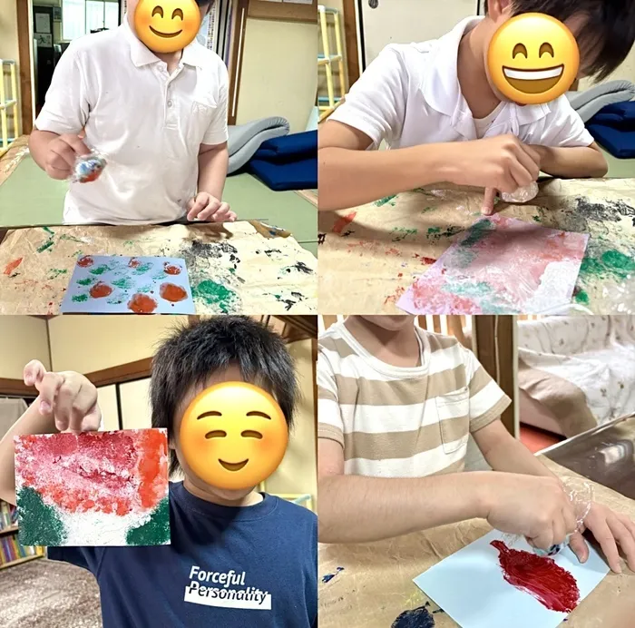 以前は手が汚れたりする活動を嫌がる子ども達でしたが、最近は絵の具を使う活動でも「まぁ後で洗えばいいか!」と豪快に参加してくれています♪
