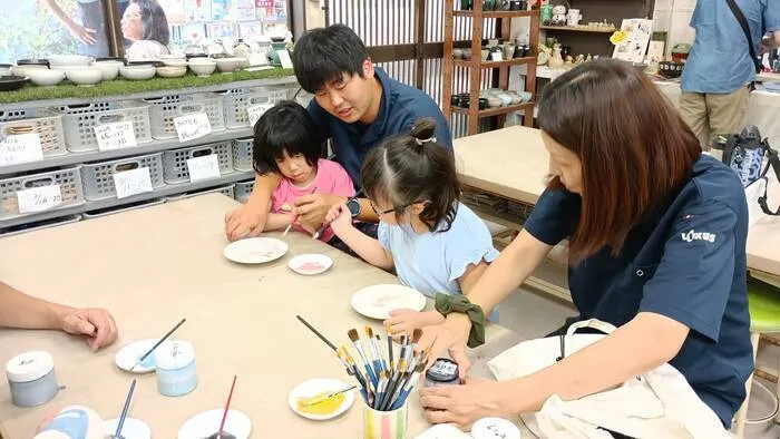 お皿か湯呑に、専用の絵具で、好きなデザインを描くという作業でしたが、みんなとても上手に描いていました💯