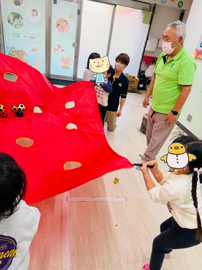 未就学児、午前の部では、それぞれが個別療育を行なった後に、小集団プログラム、ホールトラップゲームを行い、みんなで協力をして穴の空いた生地の下にボールを落としました。