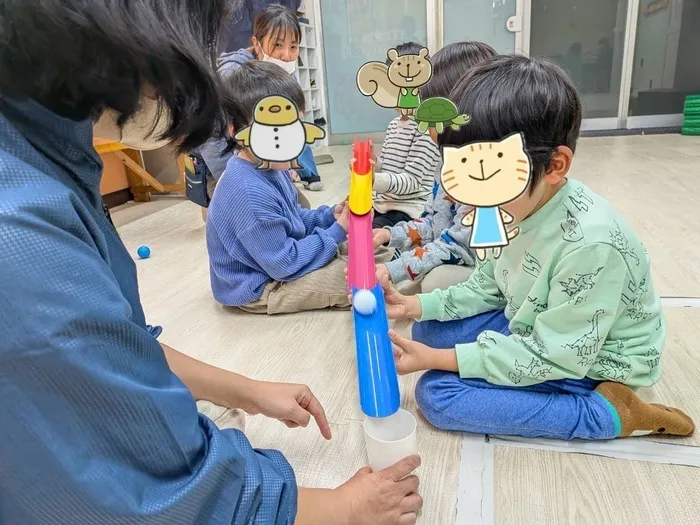 単独行動ではゲームを成功させることが難しく、お友達とどうしたらボールをコップの中に落とし込むことができるかを話し合ったり、みんなの迷惑にならないために、先生の話をちゃんと聞いてルール通りに活動をすることができるか、お友達が失敗をしても責め立てる事なく失敗を糧に次に活かせるよう前向きに考えを転換する事が出来るか等、社会的協調性が重要となるゲームです。