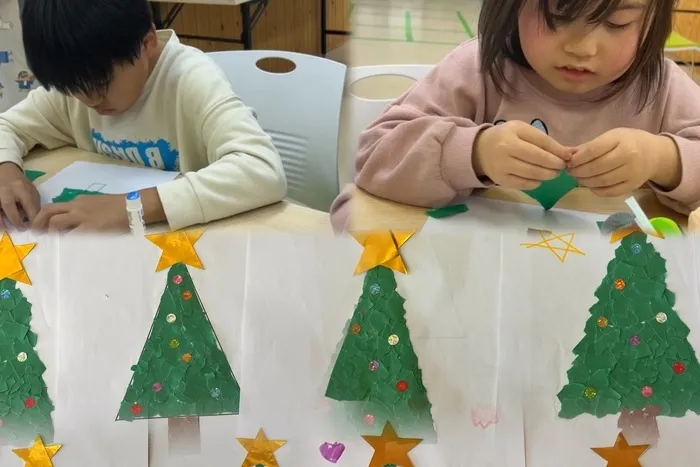 出来上がったツリーは、教室の壁いっぱいに飾っています。