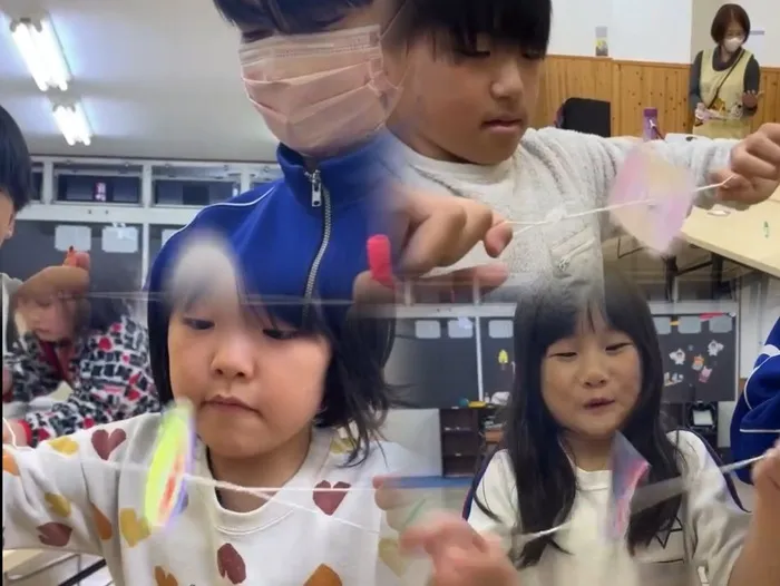 最初はうまく回らず、「あれ?」と戸惑う様子もありましたが💦、何度も挑戦するうちに、少しずつ糸の引き方や力加減をつかんでいきました。