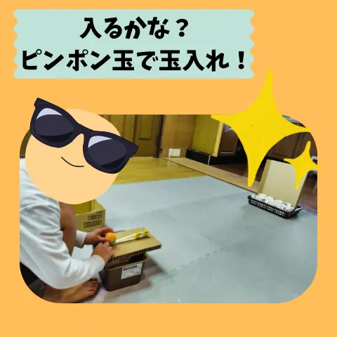 割り箸でできた発射台にピンポン玉を乗せて紙コップに入れますよ♪