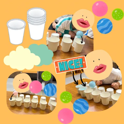 息を吹きかけて向こう側の紙コップに落とすこと!