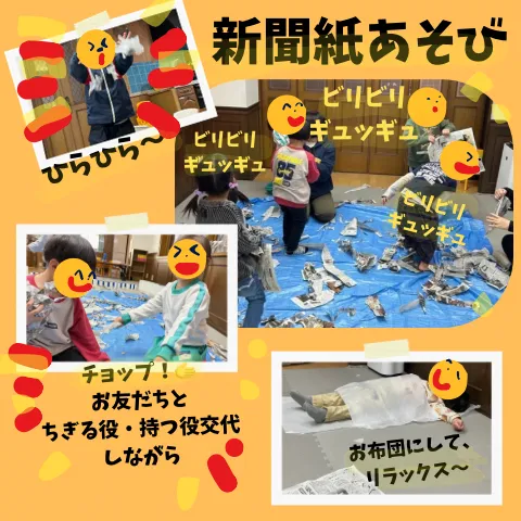 新聞を丸めてポケモンボールにしてポケモンを捕まえに行ったり、スタッフやお友だちと新聞紙をちぎっては、アナと雪の女王ごっこで