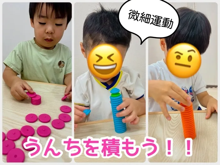 「うんちの形のブロック」を使って、高く積み上げていく遊びに挑戦しました!