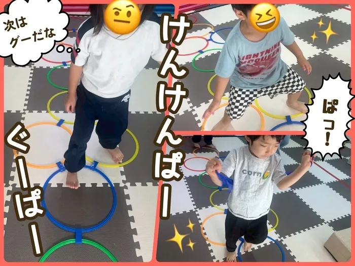 輪っかを並べて「ケンケンパー」の遊びに挑戦しました!「けんけんってなに?」「とべるかな〜」と最初はドキドキしていた子どもたち。