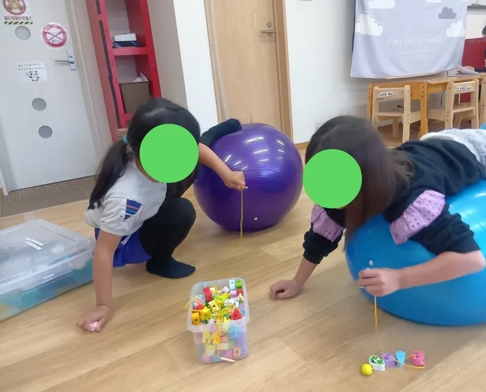 未就学児と1年生の子がバランスボールに乗りながら器用に糸通しをしてます🧵