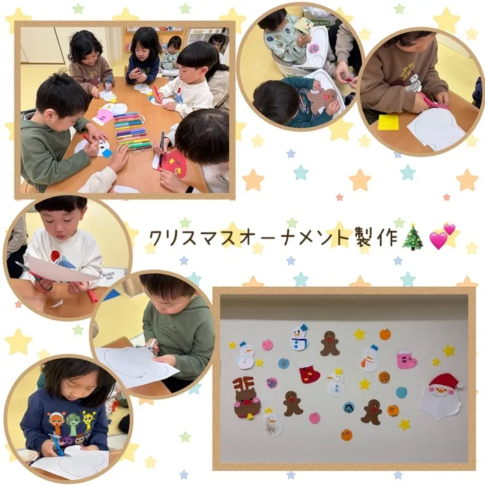 ゆきだるま、くつした、ジンジャーマン、丸のオーナメントをそれぞれ選んでもらい、好きなオーナメントを作りました🥰