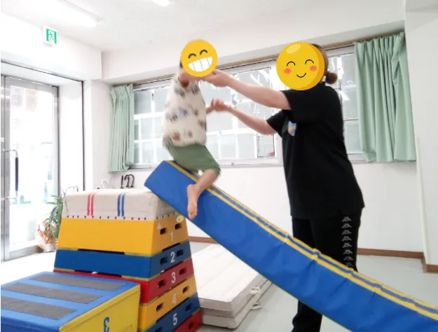 登った後はマット目掛けてジャンプ!!「ねえねえ今の見てた?」とニコニコ笑顔で指導員やお母さんに話しかけています😊
