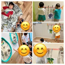 「丸める」「投げる」などの動作を遊びを通しながら行うことができ、子どもたちも新聞紙遊びを存分に楽しんでいました(^^♪