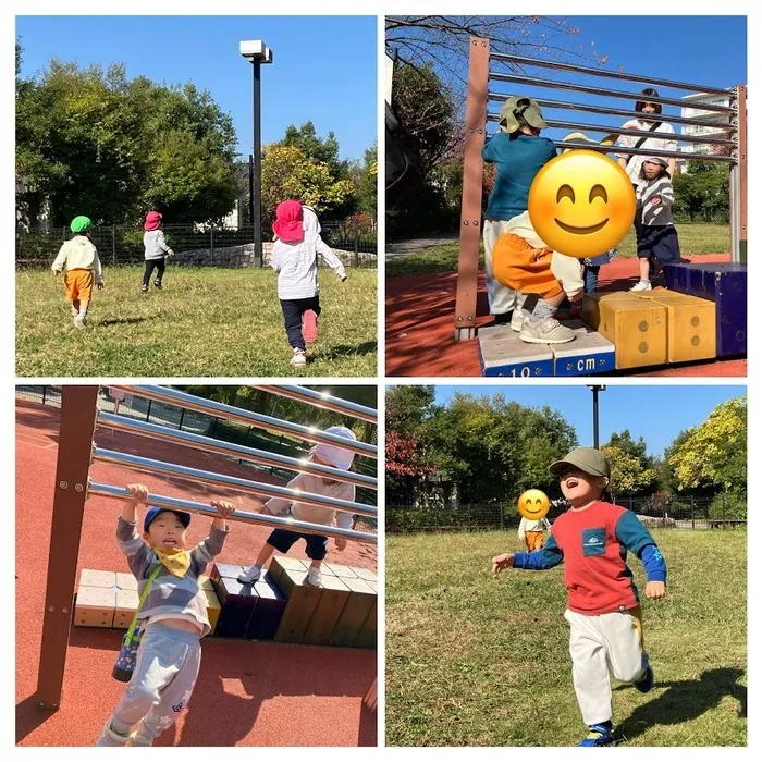 朝晩の冷え込みがぐっと深まり、秋も終盤、冬の気配を感じる季節になりました。それでも子どもたちは元気いっぱい。公園や緑道など外の活動はたくさん五感が刺激され、自由に体を動かし、笑顔いっぱいで過ごしています。