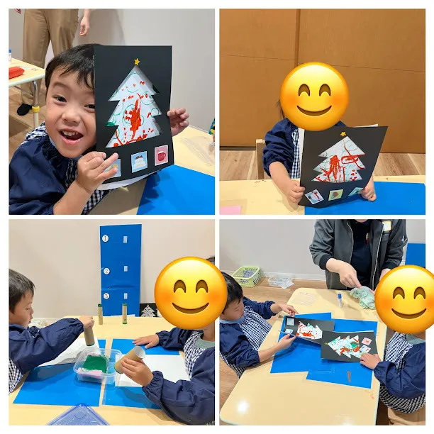 たくさんスタンプをした後は、好きなクリスマスモチーフを使って飾りつけ。たくさんある中からそれぞれの好きなモチーフを選ぶ工程はよりワクワク感が増すようで