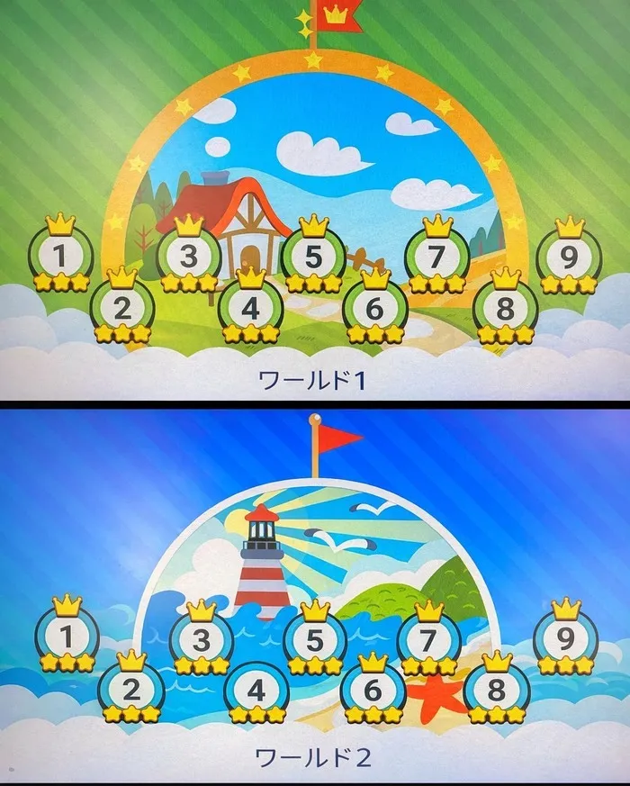 時間の関係上画像の通り、ワールド1は全部クリアし、ワールド2は王冠をすべて獲得するまであと一つ!!これからも全力で皆の取り組みを応援していきます🔥