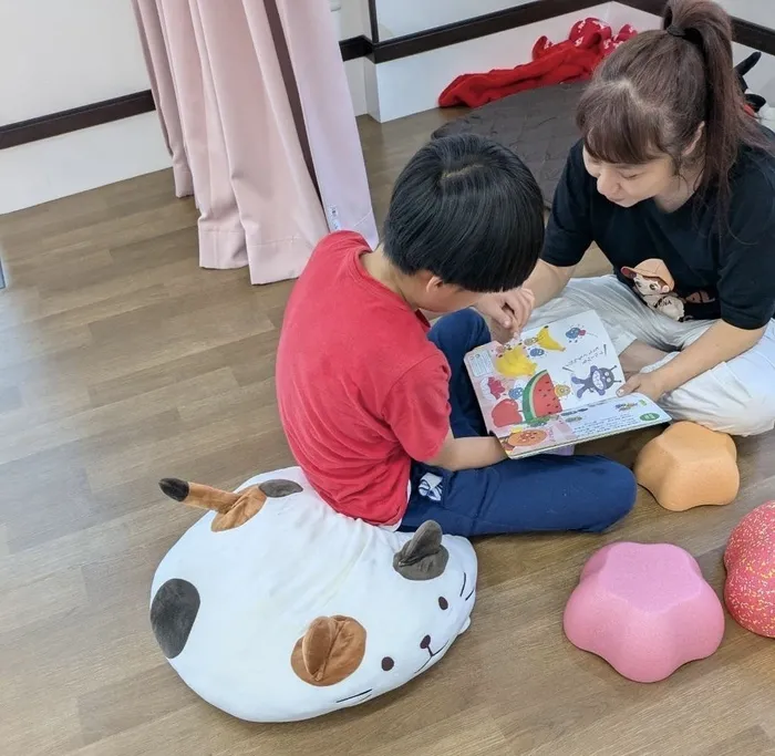 写真のお子さんは、好きなスタッフと一緒に絵本を見ながら「スイカはどれ?」「これは何?」などの質問に、指をさしたり、単語で答えてくれています。