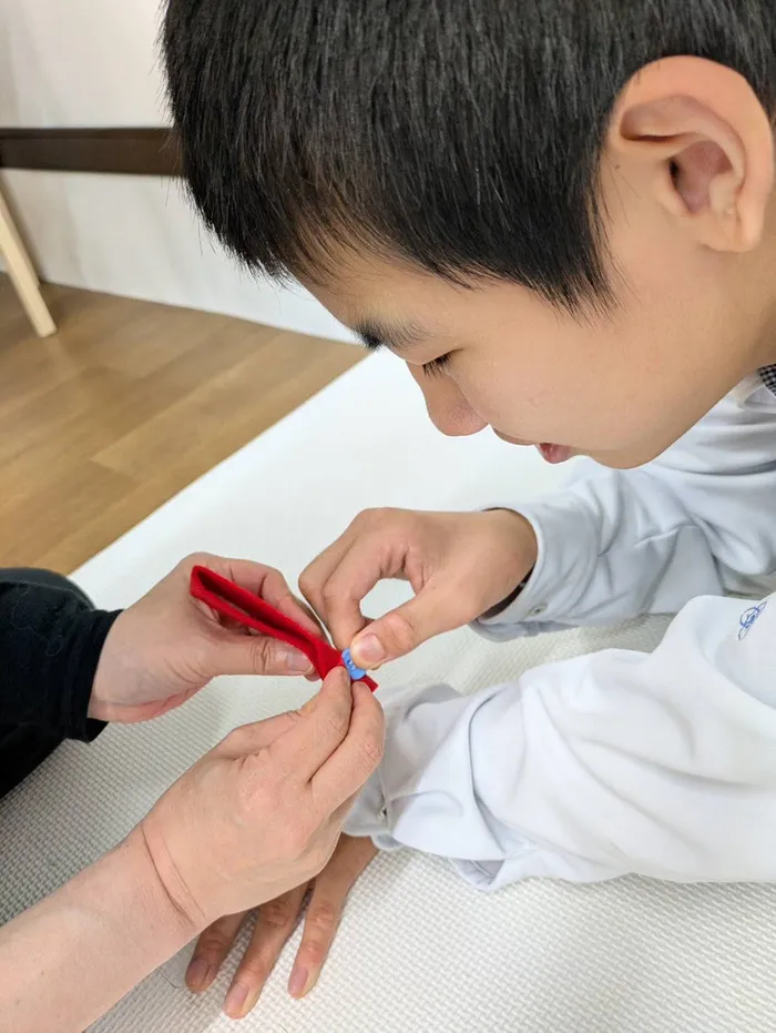 お洋服のボタンなど、日常によくある動作であるにもかかわらず難しい「ボタンしめ」、微細運動の発達を促すために最適な療育となっています!✨