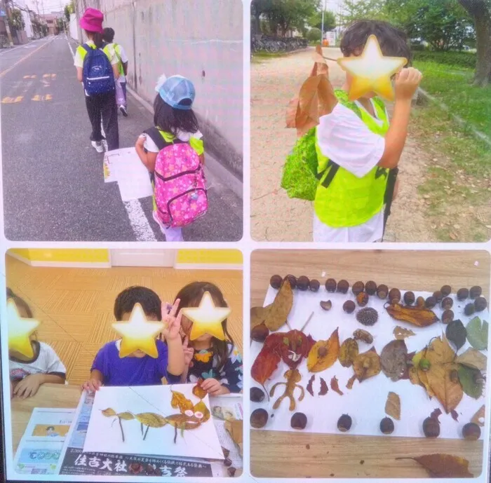 葉っぱや木の枝、木の実を選んでみんなで協力してそれぞれかわいい作品が出来上がりました!!