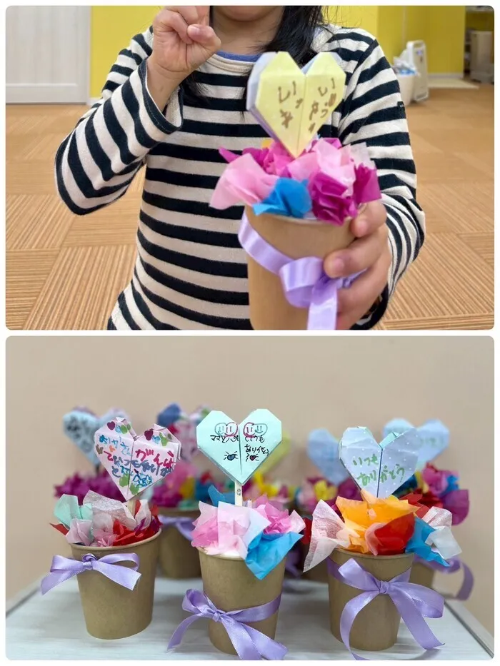 お花紙がうすくて破れやすいので、力加減なども気にしながら綺麗なフラワースタンドをつくって持ち帰りました😌💕