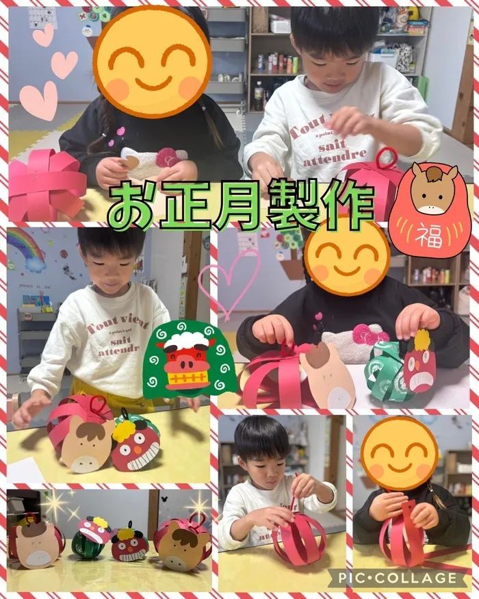 ウマと獅子舞に、自分たちで顔を描いてもらい、先に作っただるま部分に貼り付けて完成です✨