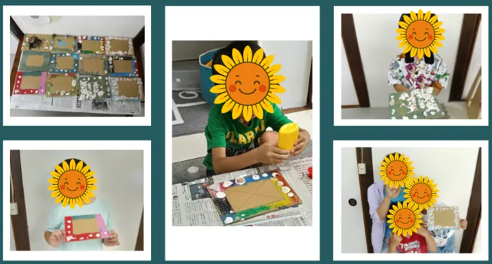 写真サイズに切った段ボールを土台にして、周りに貝殻を貼ったり、折り紙をちぎって飾ったり、クレヨンやペンで絵を描いたり…。それぞれが思い思いに工夫しながら、自分だけの作品をデザインしていきました🎨。