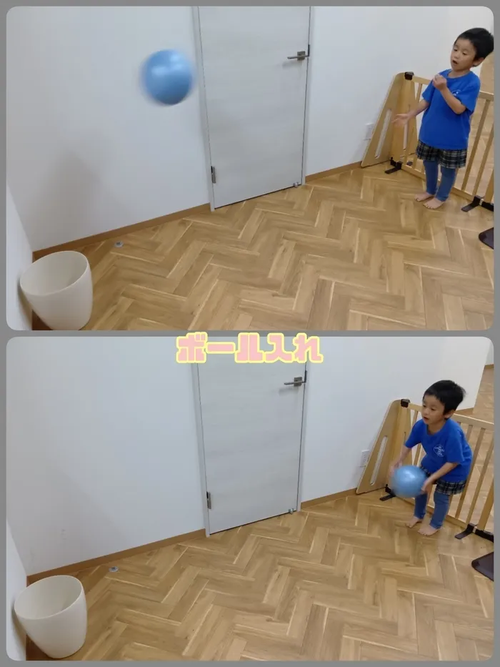 初めは手が届く距離から始めて徐々に距離を離していき、最終的には2m位離れたところから上手にボールを入れることが出来ていましたよ✨️