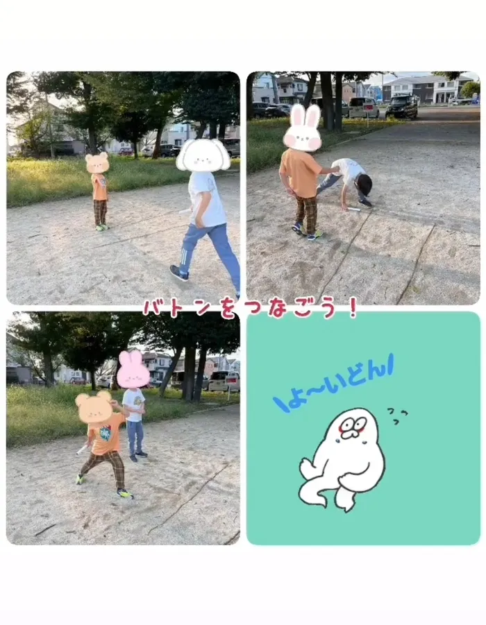 近くの公園に出て、手作りのバトンでミニリレーを行っています。