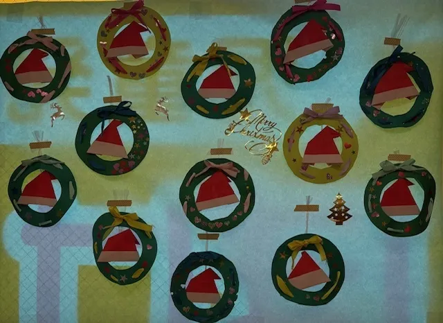 そんな今回はリースを作りました。リースの形にハサミで切ってシールを貼って、そこに穴を開けてリボンを通し、最後に折り紙でサンタの帽子を折る。と長い長い工程でしたがみんな想像以上に頑張ってくれました。