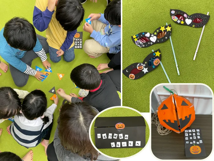 絵本を読んでいると突然の🚪『コン、コン』というノック音に、みんな目を見開いてびっくり👀!ドアを開けると、ジャックオーランタンからのバラバラになった文字の手紙が。