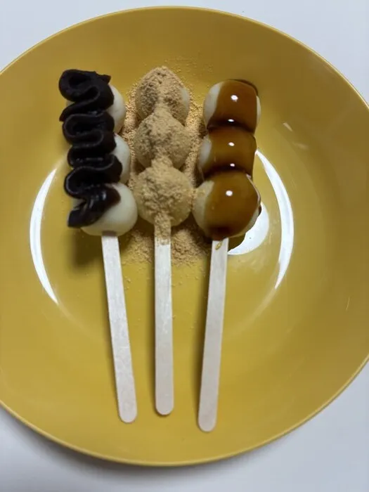 分量を量ったり、混ぜたり、丸めたり、串に刺したりしました。白玉団子に好きなトッピング「きな粉・あんこ・みたらし」をして食べました😋