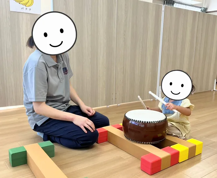 和太鼓を見ると、組体操の音に合わせて叩き始めた1歳児さん。見て、聞いて、真似っこして。一緒にしているつもりのようで、とても嬉しそうでした!