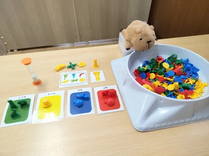 付属のカードを使い6個のパーツを見つける、1つだけをピックアップしたカードを使う、色分けをするなど一人ひとりに合わせた様々な遊び方をしています。