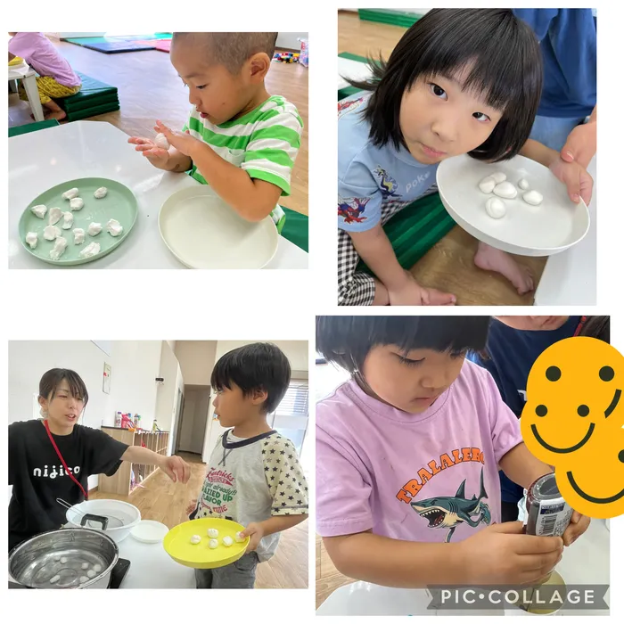 子どもたちはスタッフのお手本をよーく見ながらも、まん丸だけでなく、細長い形や小さな形など、工夫して作っていました☺️✨