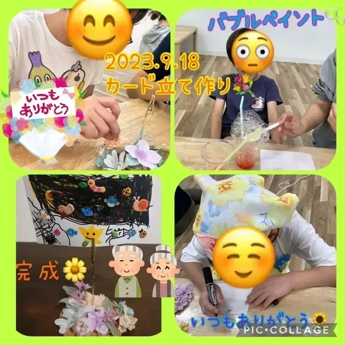 敬老の日イベントとして、バブルペイント🫧を活用したメッセージカード💌とお花🏵で彩ったカード立て作りを行いました🤩