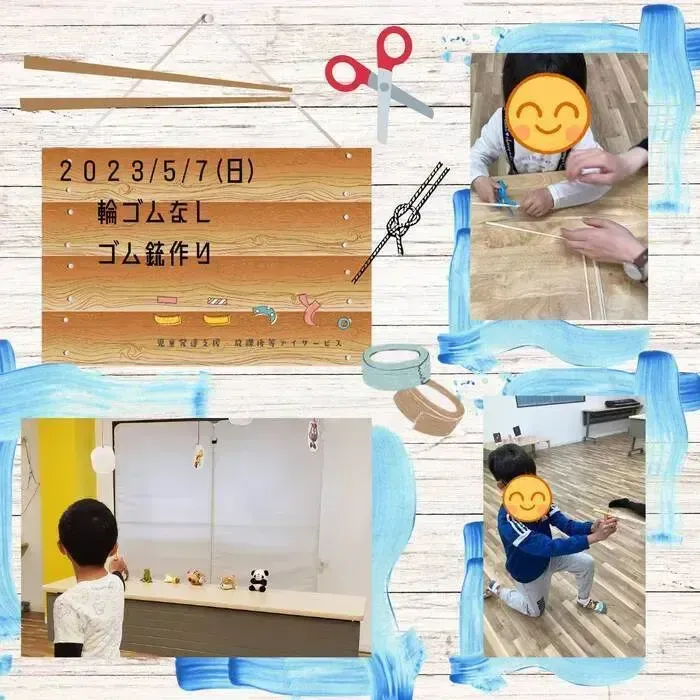 引き金の部分を丸ゴムで結ぶ作業は最難関の作業となりましたが、職員と一緒に一生懸命丸結びを作り、トリガーの役割が果たせるよう角度を調整しながら完成させることができました⭐️