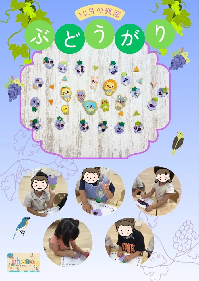 完成したぶどうは、どれも個性たっぷりでとてもすてきに仕上がり、壁に飾ると「ぶどう狩りだ!」とはしゃぐ子どもたちの姿が見られました🥳