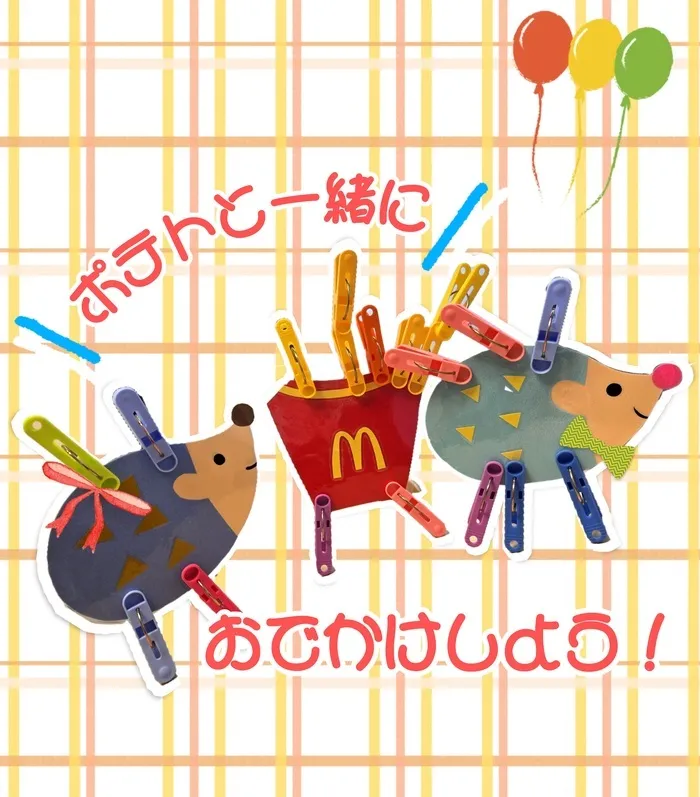 動物やポテトの台紙に、洗濯ばさみをはさんでもらいます🤏2つ繋げて長いポテトも作ったり、ハリネズミに足を付けて立たせてあげたりしていました👏👏👏