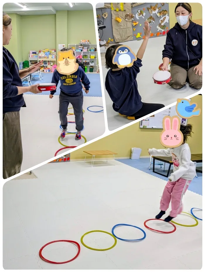 職員が叩くタンバリンのリズムに合わせてフープの中をジャンプしていきます🕳️