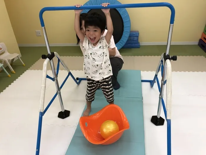 鉄棒にぶら下がるHくん!鉄棒をしっかりと手のひらいっぱいに力を入れて握りしめます。そして、腕の力も凄く使います✊🏻