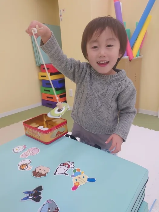 クリップの上に磁石を合わせ、「釣れるかな、釣れるかなー!」と集中するYくん。