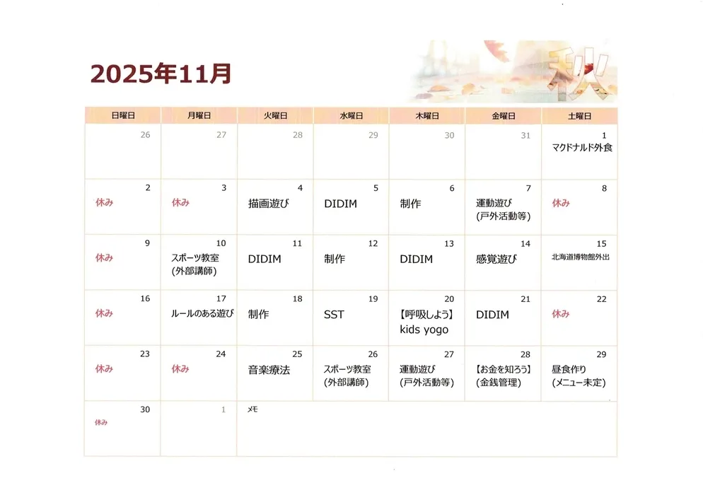 ぐりーんあっぷる白石教室では、11月も季節を感じながら楽しめる多彩な活動を予定しています。