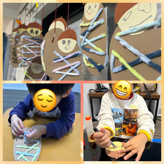毎月の制作を行う中で、顔を描く作業はたくさん行ってきたのですが、みんなだんだんと上手になってきていて、とても成長を感じます🥰さまざまな表情をしたみのむしたちがお部屋にぶら下がって、ほっこり秋を感じるお部屋が完成しました♡