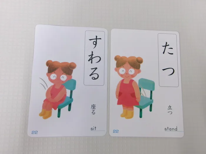動作語の反対言葉は、「椅子に座る」「椅子から立つ」「腕を伸ばす」「腕を曲げる」など、カードのイラスト見たりしていますが、