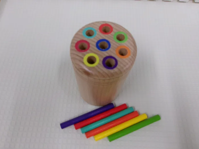 カラフルな色の棒を、同じ色の穴にポトンと落としていくシンプルな教材です。