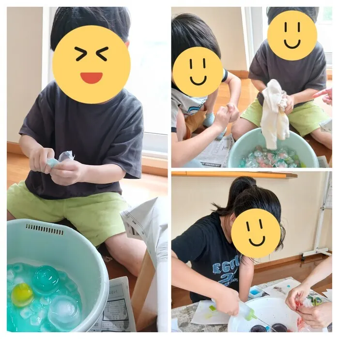 という流れで行いましたが、お友達の遊び心が炸裂💛氷で紙にお絵かきをしたり、色付き氷で色水遊びをしたり、楽しい時間となりました🎵