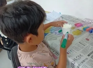 初めにマジックを使って自由に絵を描き、その後はさみを使ってビニール袋の端を切り、大きく1枚に広げました。紙コップの口の部分に、切り開いたビニールの四隅をセロテープで固定して完成です。自分の頭より上に向けて投げるとパラシュートが開いて、ゆっくり落下してきました。