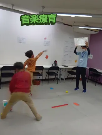 音楽療育で、曲ごとに動きを変えていく活動を行いました。今回は5曲を準備し、まずは1曲ずつの動きを指導員が手本を見せました。視覚でも確認できるように、曲と動きはホワイトボードに記載しました。曲が変わると、直ぐに動きを変えていくのです。曲に集中して次はどんな動きかを考える様子が見られていました。活動を通して認知、行動へとつながげていきました。